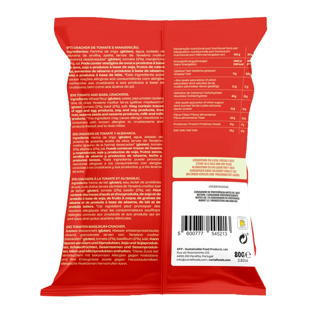 azeite, larvas de Tenebrio molitor (tenébrio) desidratadas* (glúten), tomate (2%),