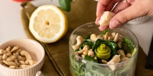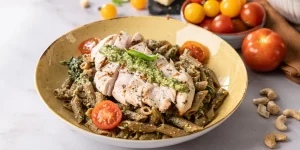 O molho pesto dá alma a este prato. Feito com ingredientes simples e saborosos, transforma uma receita clássica numa opção saudável e funcional. Além disso, o toque do parmesão e dos cajus dá um equilíbrio perfeito entre cremosidade e textura.