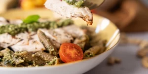 Tudo isto é envolto num pesto 100% caseiro, feito com manjericão fresco, alho, cajus, azeite virgem extra e parmesão. Por isso, consegues um sabor intenso, aromático e saudável, sem aditivos nem ingredientes processados.