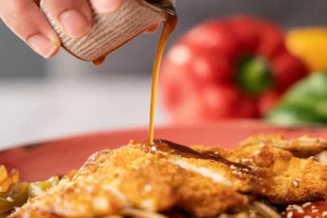 Molho teriyaki: molho de soja, molho Hoi sin, molho de ostras, gengibre, alho, laranja, água e maizena.