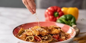 Acompanhamos o frango com esparguete integral, que contém mais fibra e promove uma digestão lenta. Ou seja, mantém-te saciado e com energia estável durante o dia. Além disso, as sementes de sésamo adicionam uma textura crocante irresistível, ao mesmo tempo que fornecem gorduras saudáveis e minerais essenciais como zinco, magnésio e cálcio. Esta base é ideal para uma refeição reconfortante mas equilibrada.