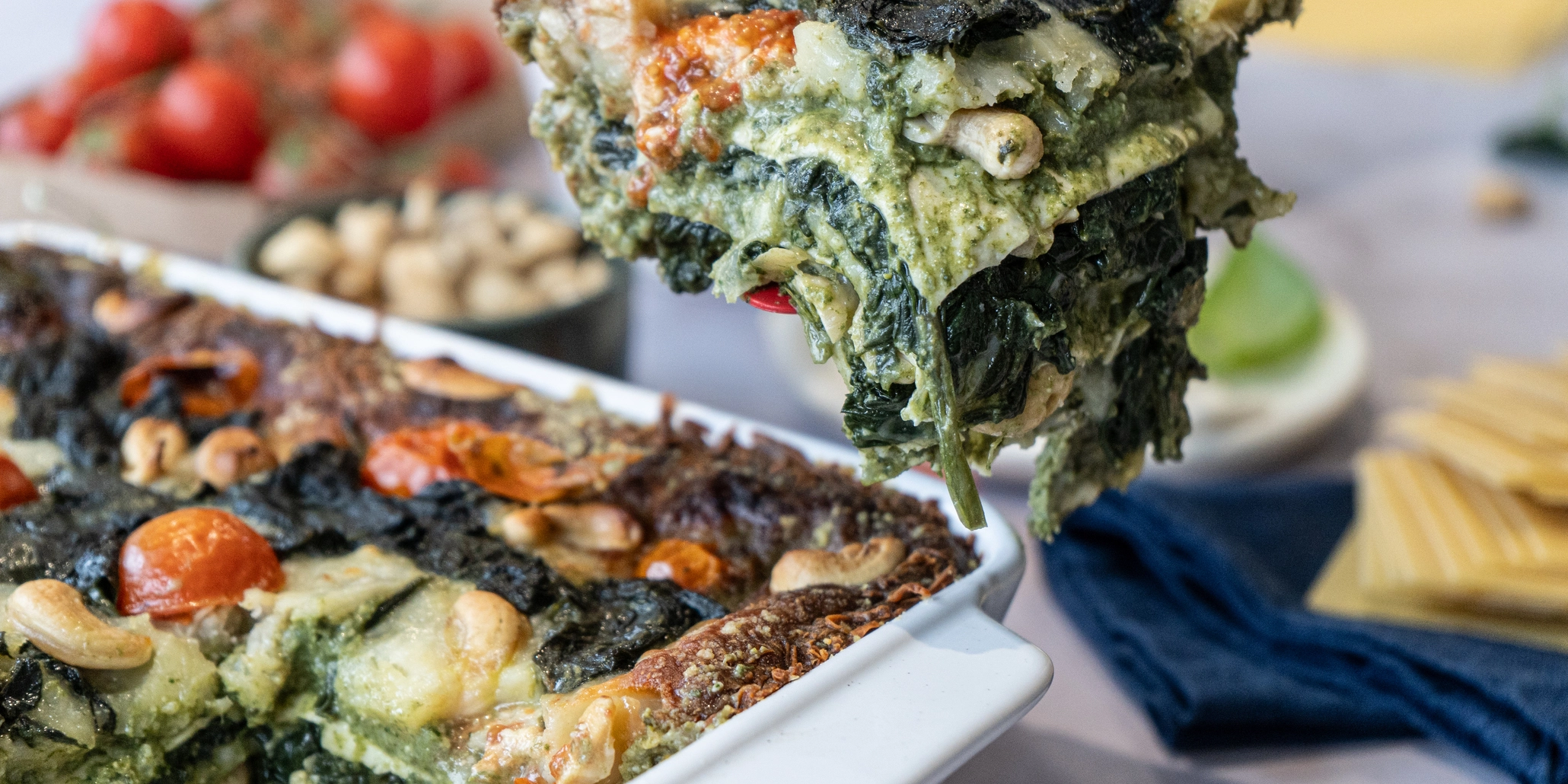 Lasanha caprese: Massa de lasanha integral, mozzarela light, bebida vegetal de soja, espinafres, cebola, cajus, manjericão, queijo fresco, queijo parmesão, azeite, alho, creme vegetal e tomate cherry.