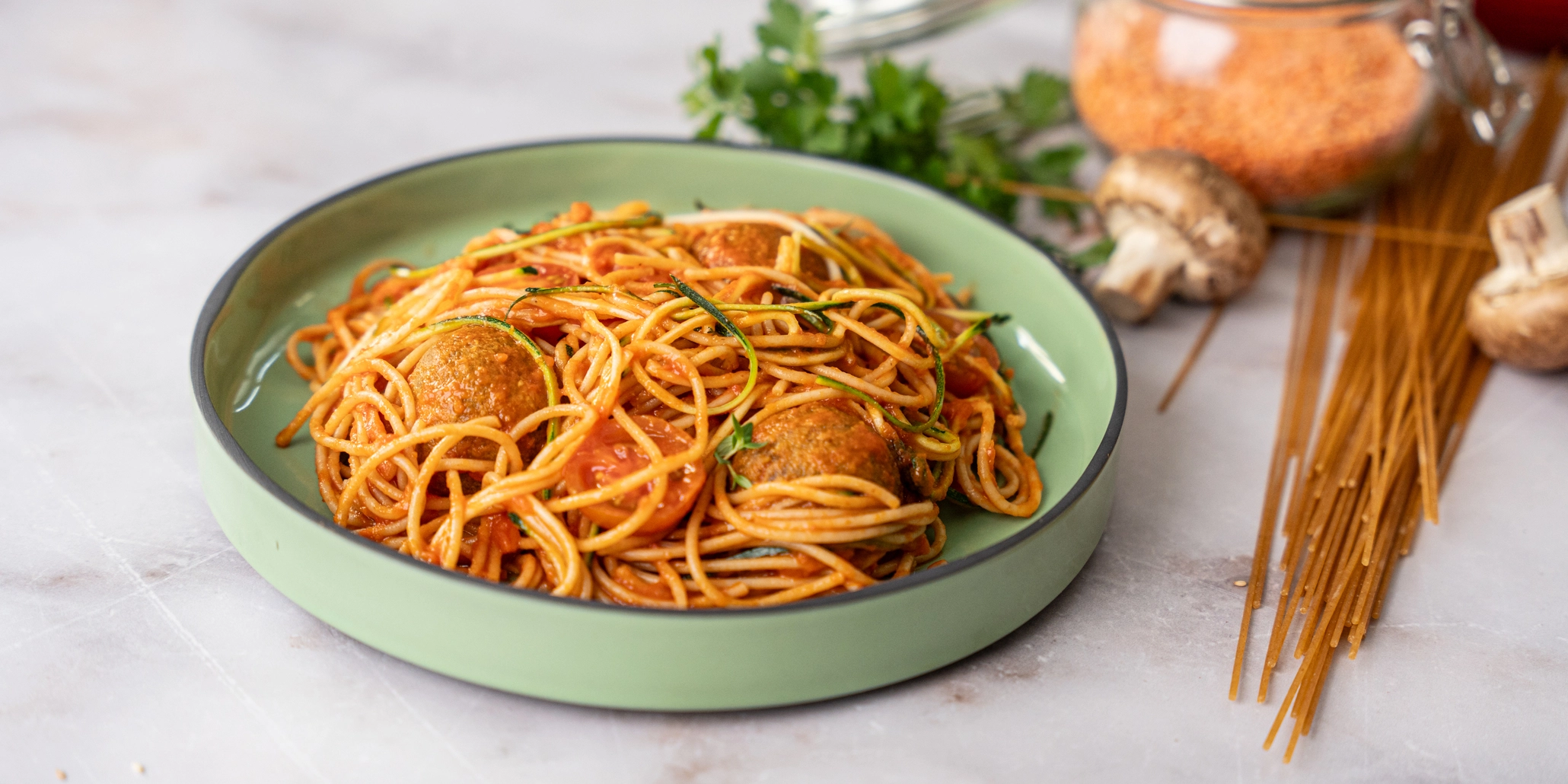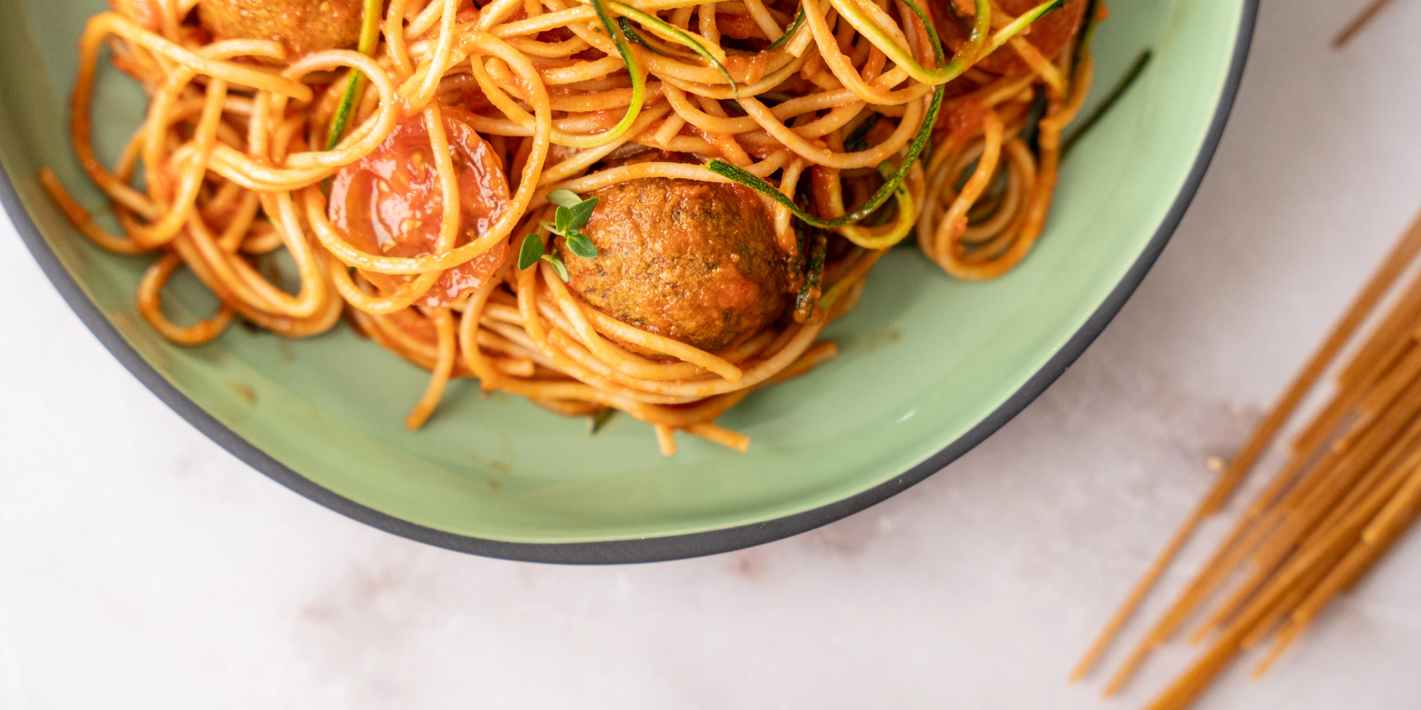 Servimos as almôndegas sobre uma base de massa integral al dente. Esta escolha oferece saciedade prolongada e energia estável ao longo do dia. Para tornar o prato ainda mais completo, adicionamos um molho de tomate caseiro repleto de sabor.