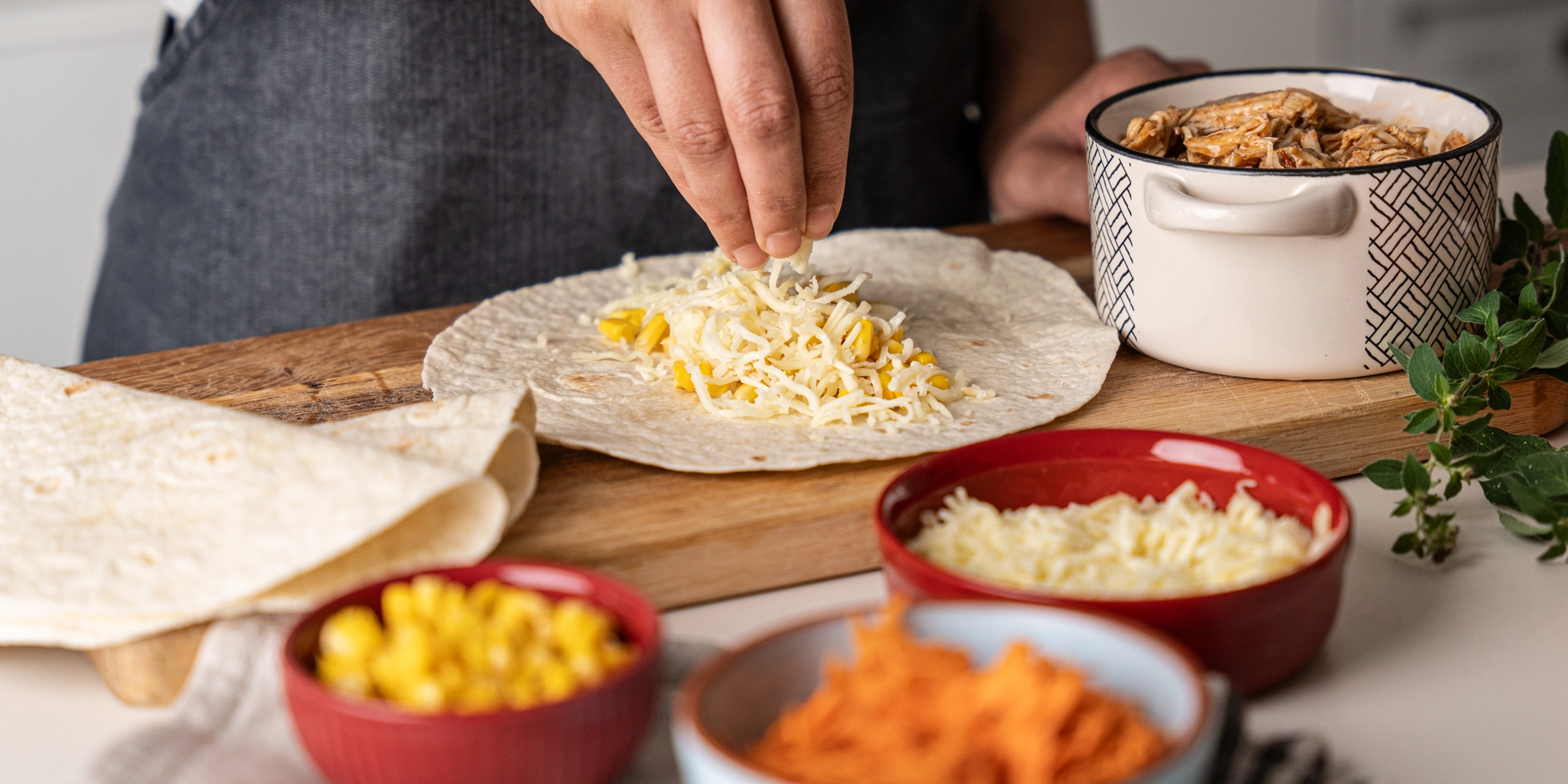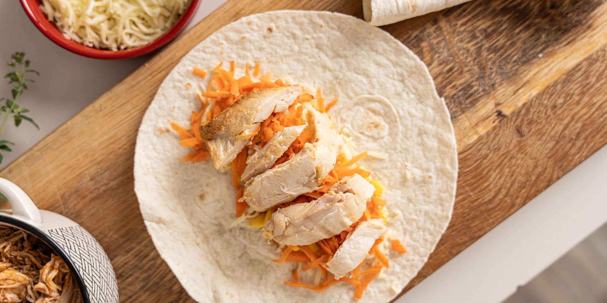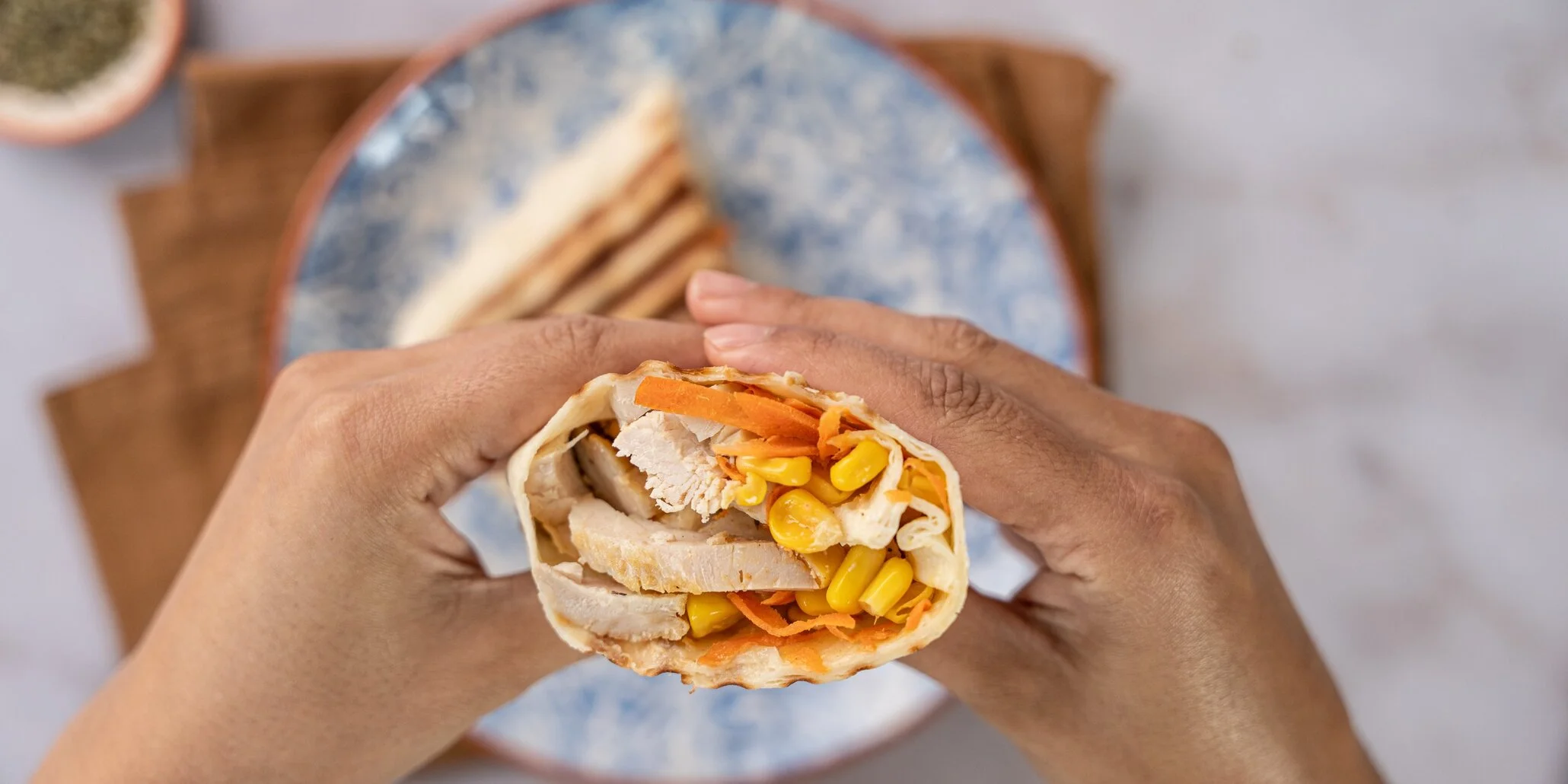 Este wrap junta ingredientes frescos e funcionais para uma refeição completa. A cenoura ralada e o milho doce acrescentam crocância, doçura e uma boa dose de vitaminas e fibras. Tudo é envolvido numa tortilha de trigo integral, leve e macia, rica em fibra alimentar que contribui para a saciedade e para uma digestão mais equilibrada.